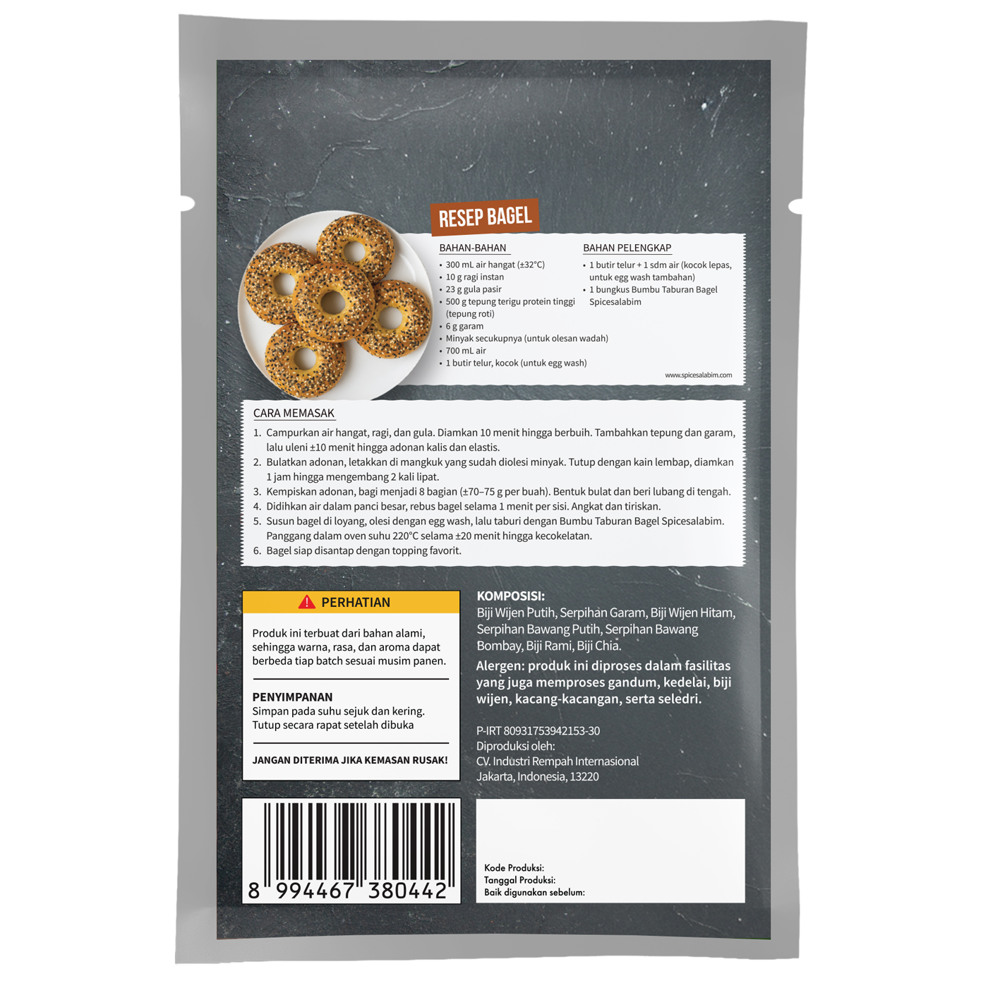 Spicesalabim Bumbu Taburan Bagel adalah bumbu tabur instan siap pakai yang dirancang untuk menghadirkan rasa khas everything bagel di rumah Anda. Bumbu ini cocok untuk taburan roti, salad, kentang, dan aneka camilan. Menggabungkan rempah pilihan, garam, dan bumbu pelengkap yang ditakar untuk sekali pakai, cukup satu sachet yang praktis tanpa perlu menyiapkan bumbu tambahan.