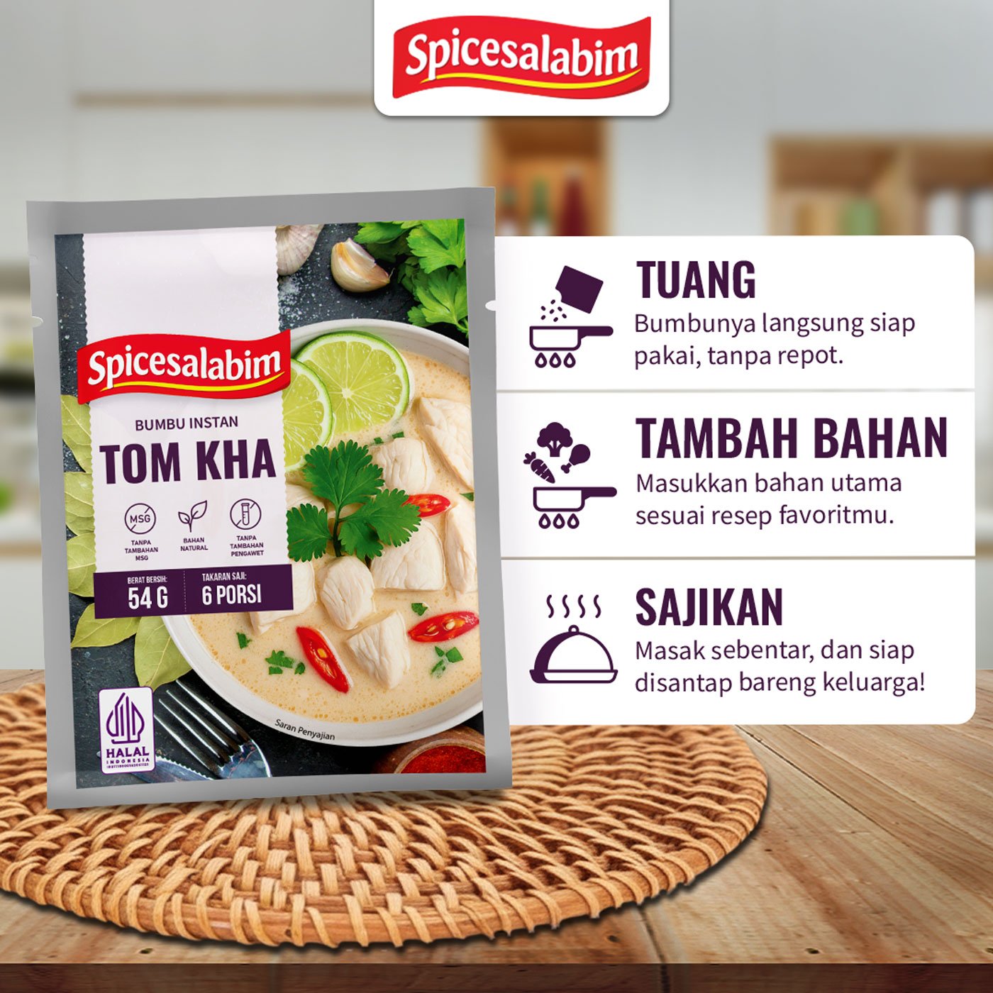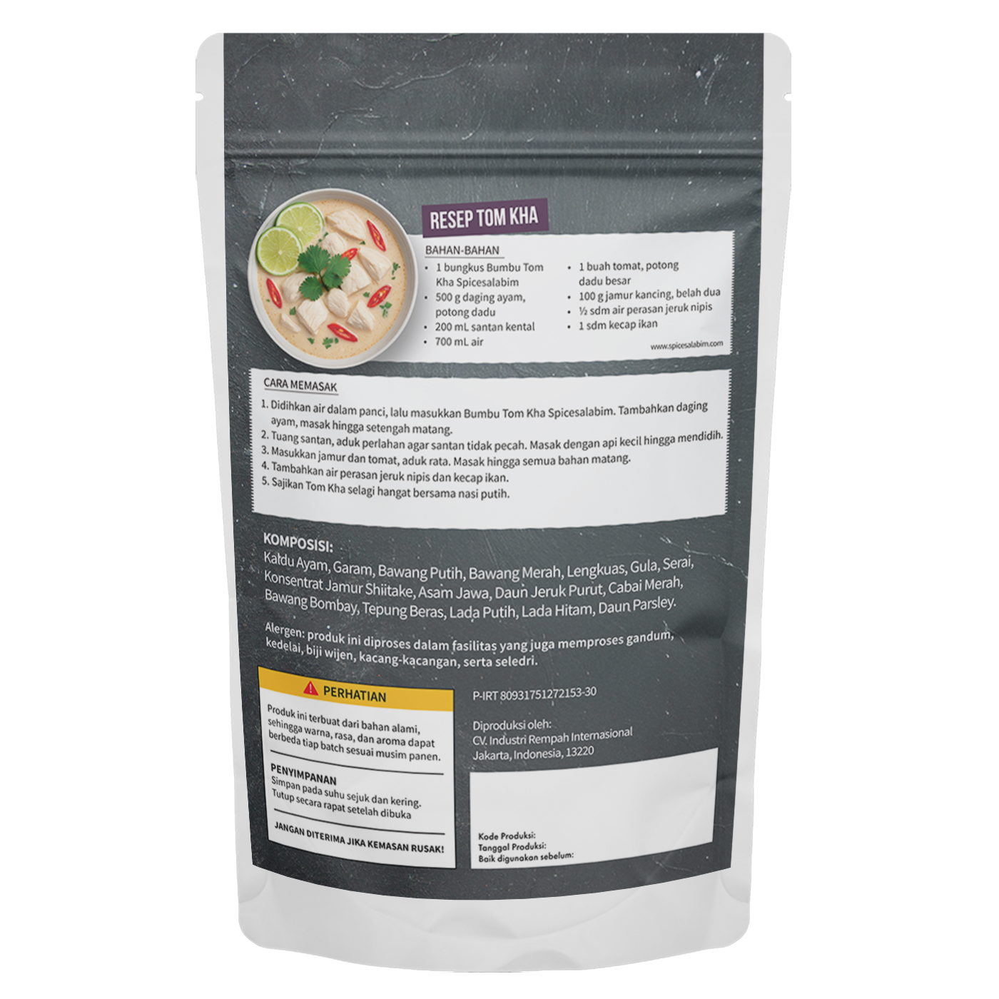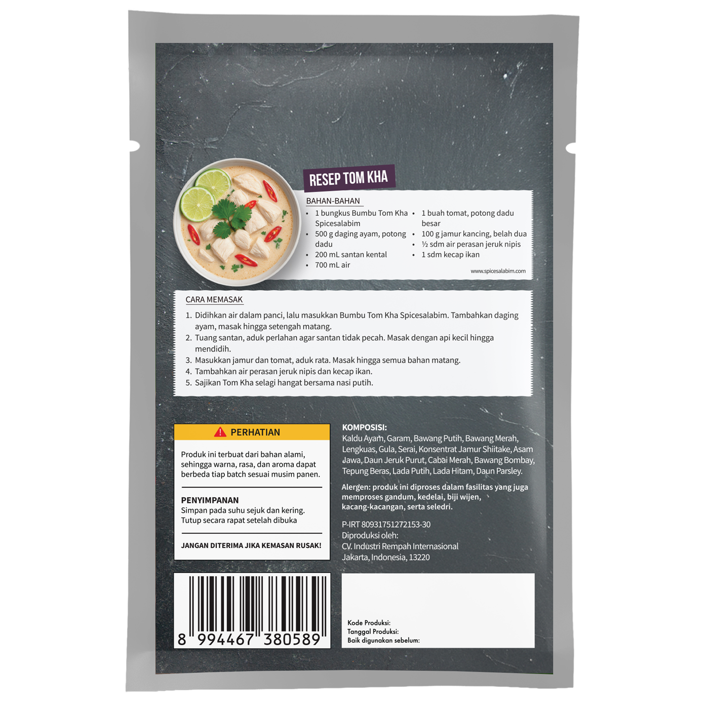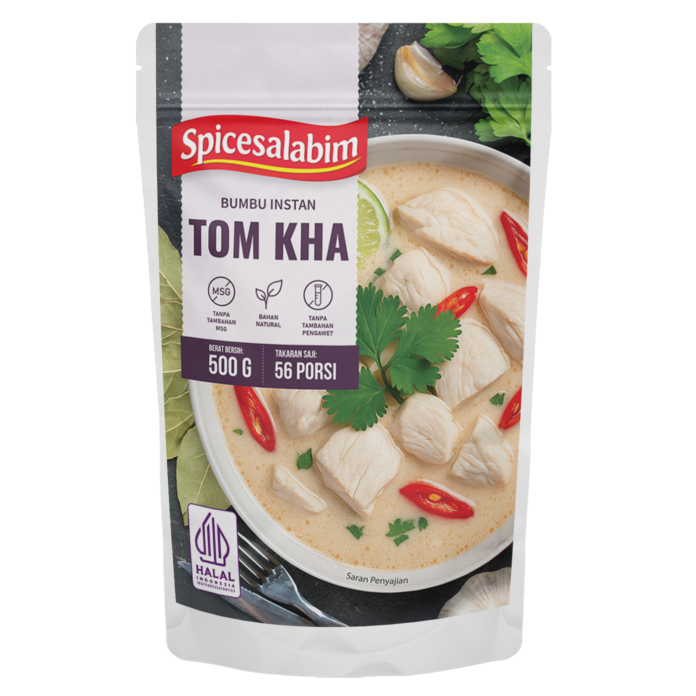 – Komposisi Bumbu Tom Kha Spicesalabim – Kaldu Ayam, Garam, Bawang Putih, Bawang Merah, Lengkuas, Gula, Serai, Konsentrat Jamur Shiitake, Asam Jawa, Daun Jeruk Purut, Cabai Merah, Bawang Bombay, Tepung Beras, Lada Putih, Lada Hitam, Daun Parsley