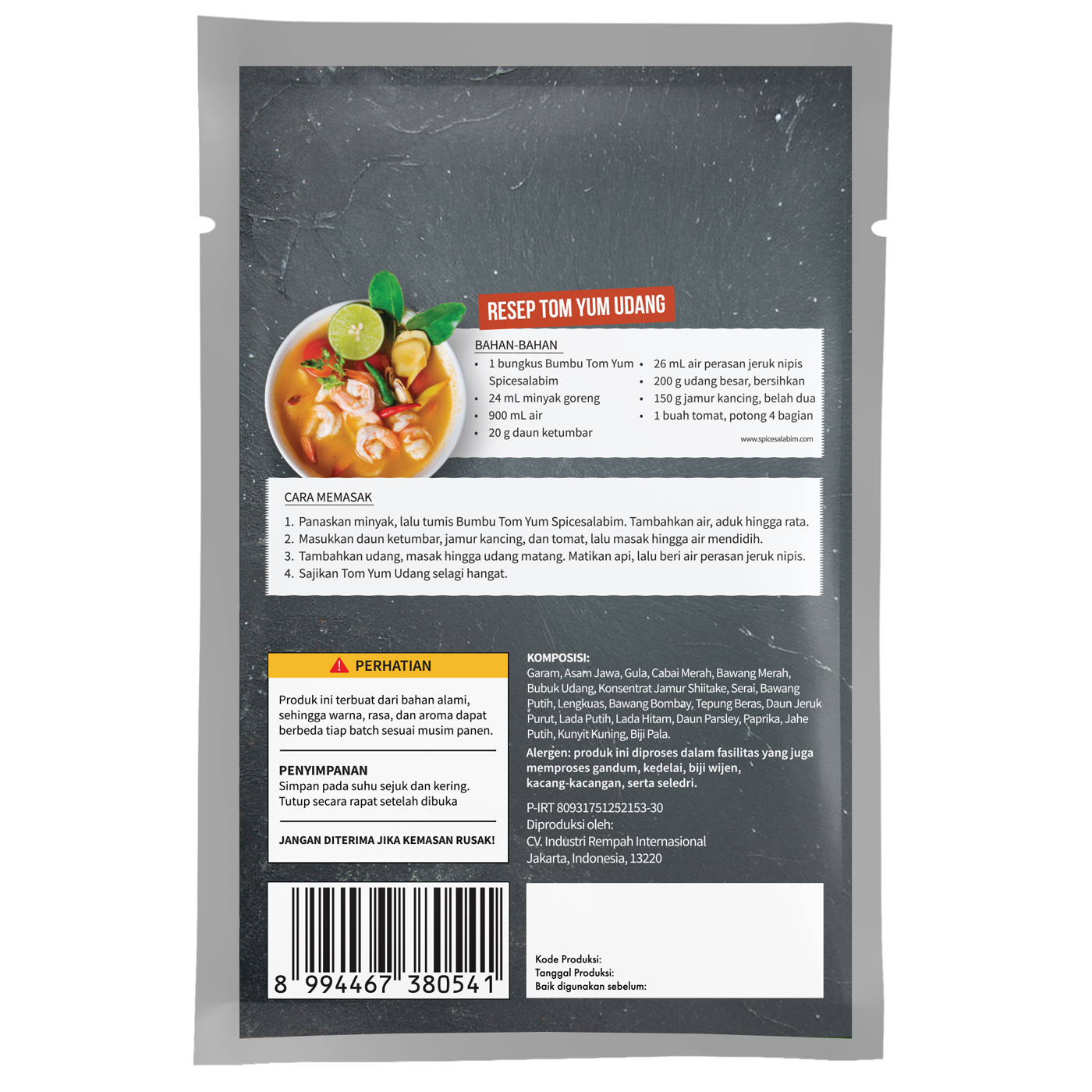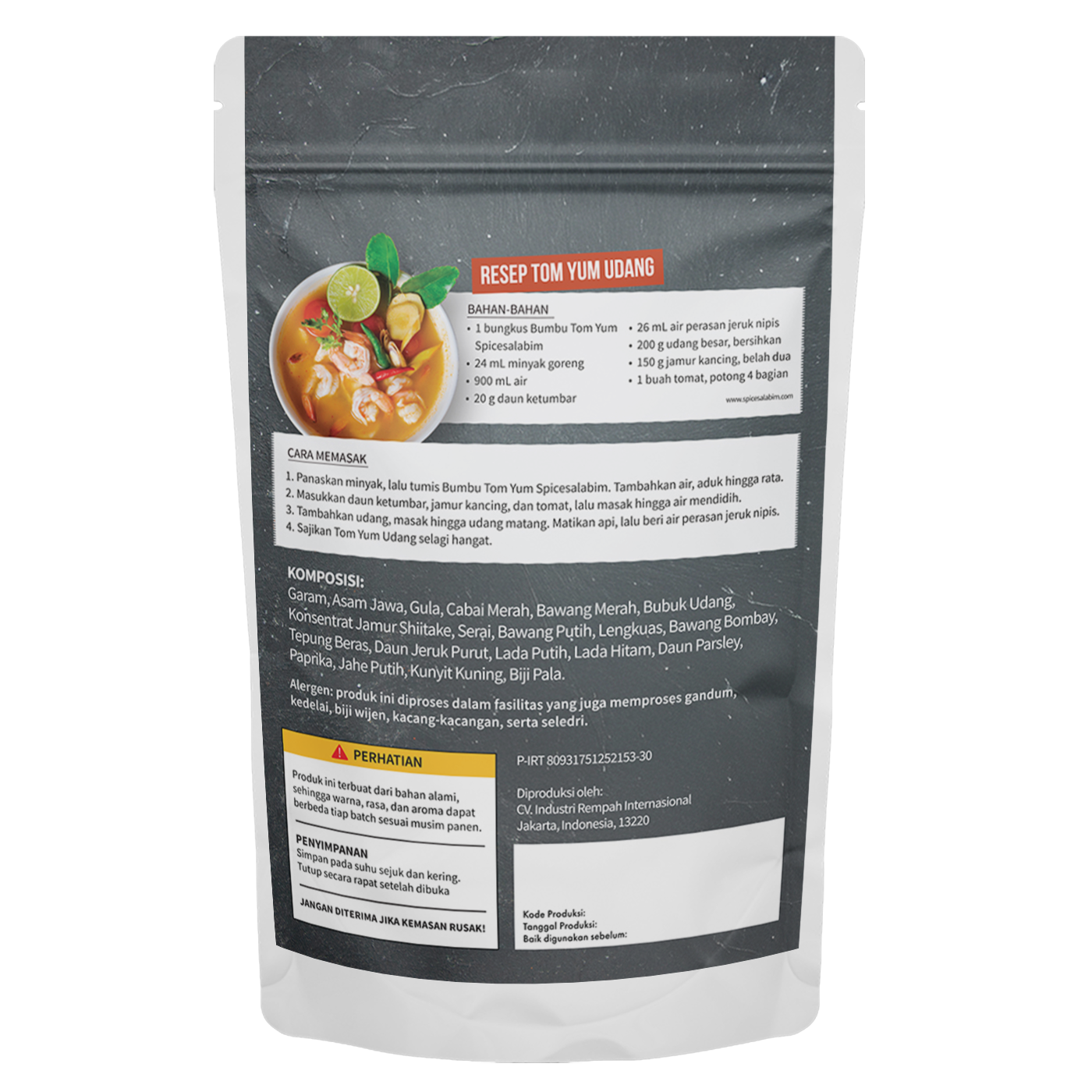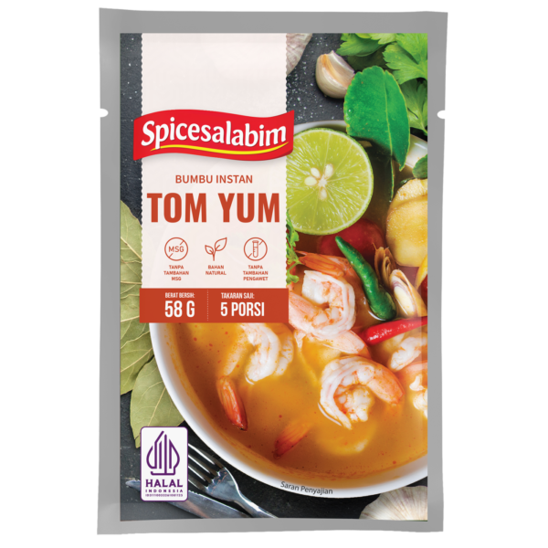 – Komposisi Bumbu Tom Yum Spicesalabim – Garam, Asam Jawa, Gula, Cabai Merah, Bawang Merah, Bubuk Udang, Konsentrat Jamur Shiitake, Serai, Bawang Putih, Lengkuas, Bawang Bombay, Tepung Beras, Daun Jeruk Purut, Lada Putih, Lada Hitam, Daun Parsley, Paprika, Jahe Putih, Kunyit Kuning, Biji Pala