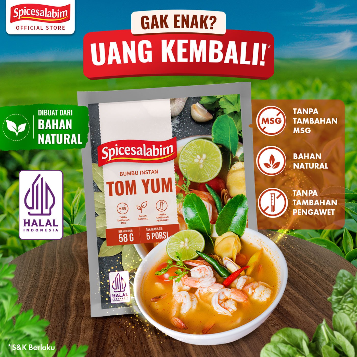 Bumbu Tom Yum Spicesalabim, bumbu instan yang diracik khusus buat kamu yang mau masak praktis dengan rempah yang natural. Terbuat dari rempah asli, tanpa tambahan MSG, tanpa pengawet, dan tanpa bahan berbahaya. Cukup satu bumbu untuk bikin masakan gurih, enak, dan sehat.