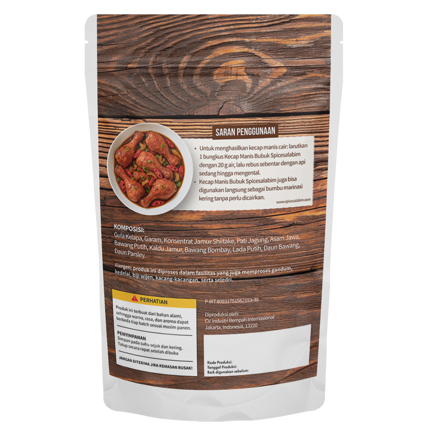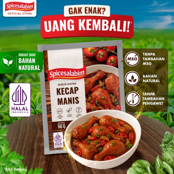 – Komposisi Kecap Manis Bubuk Spicesalabim – Gula Kelapa, Garam, Konsentrat Jamur Shiitake, Pati Jagung, Asam Jawa, Bawang Putih, Kaldu Jamur, Bawang Bombay, Lada Putih, Daun Bawang, Daun Parsley